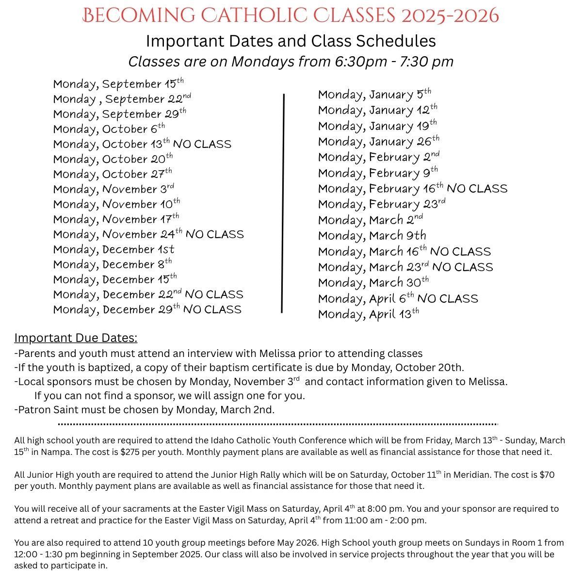 This sacrament prep class is for youth in grades 6th – 12th that are seeking full communion into the Catholic faith and have either not yet been baptized and/or have not yet received their first Holy Communion. Youth enrolling in the Becoming Catholic class must schedule an initial meeting with the youth minister before beginning the classes. (Email Melissa at MGuerra@RisenChristBoise.org to schedule a meeting)